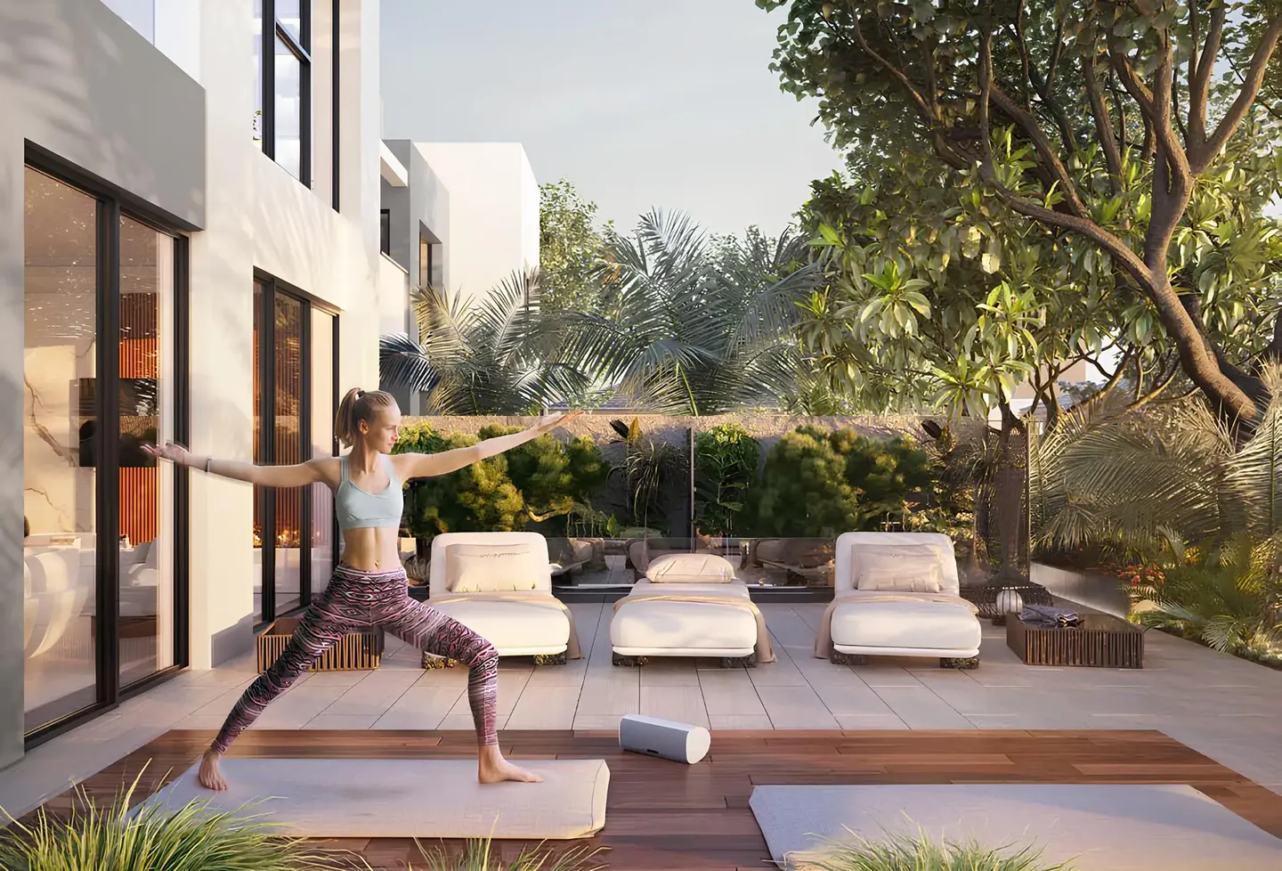 The exterior architecture is contemporary, defined by clean geometric lines, large windows, and a restrained color palette that blends seamlessly with the surrounding greenery. The project offers 3- and 5-bedroom townhouses, as well as 4-bedroom villas, designed for family living with well-balanced and functional layouts.
