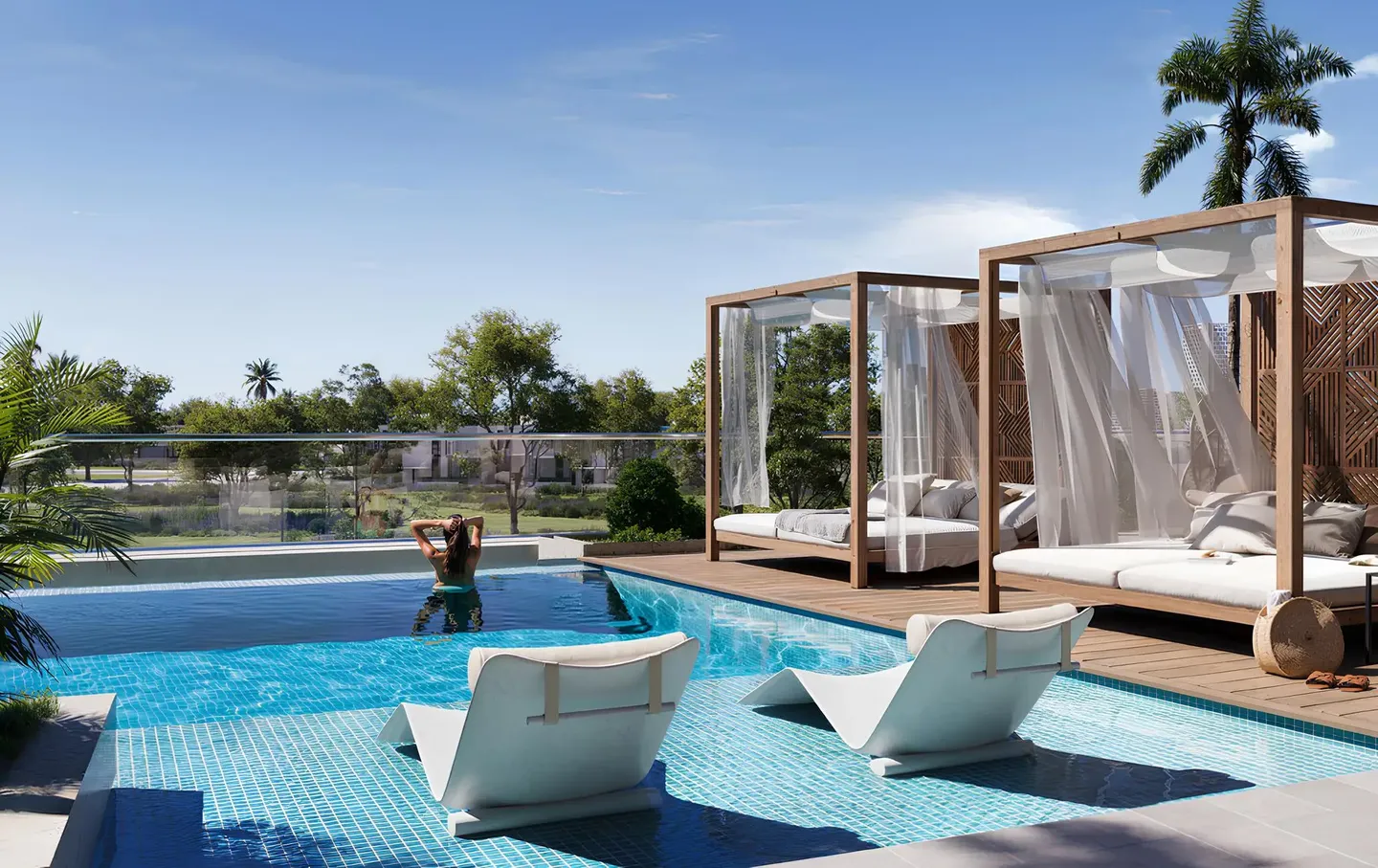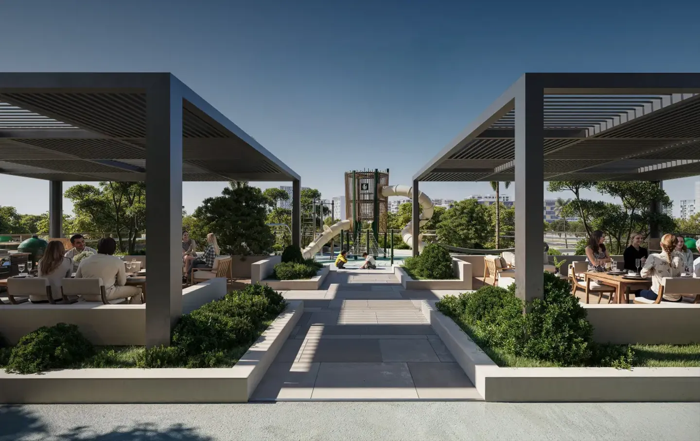 Residents have access to a wide range of amenities, including swimming pools for adults and children, an indoor gym, a jogging track, courtyards, BBQ areas, multipurpose halls, an open rooftop cinema, pool terraces, cabanas, sun loungers, kids’ play areas and open lawns.