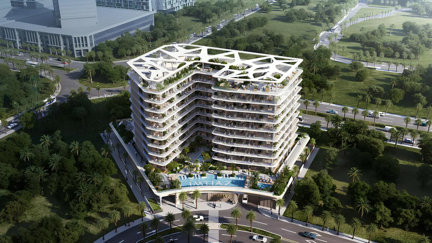 Inara Residence by Imtiaz is a residential complex by Imtiaz Developments, located in Dubai South. The project features a building with a basement level, a ground floor, nine residential floors and a roof. The exterior is designed in a contemporary style with soft lines and smooth forms that open the façade to light and landscape.