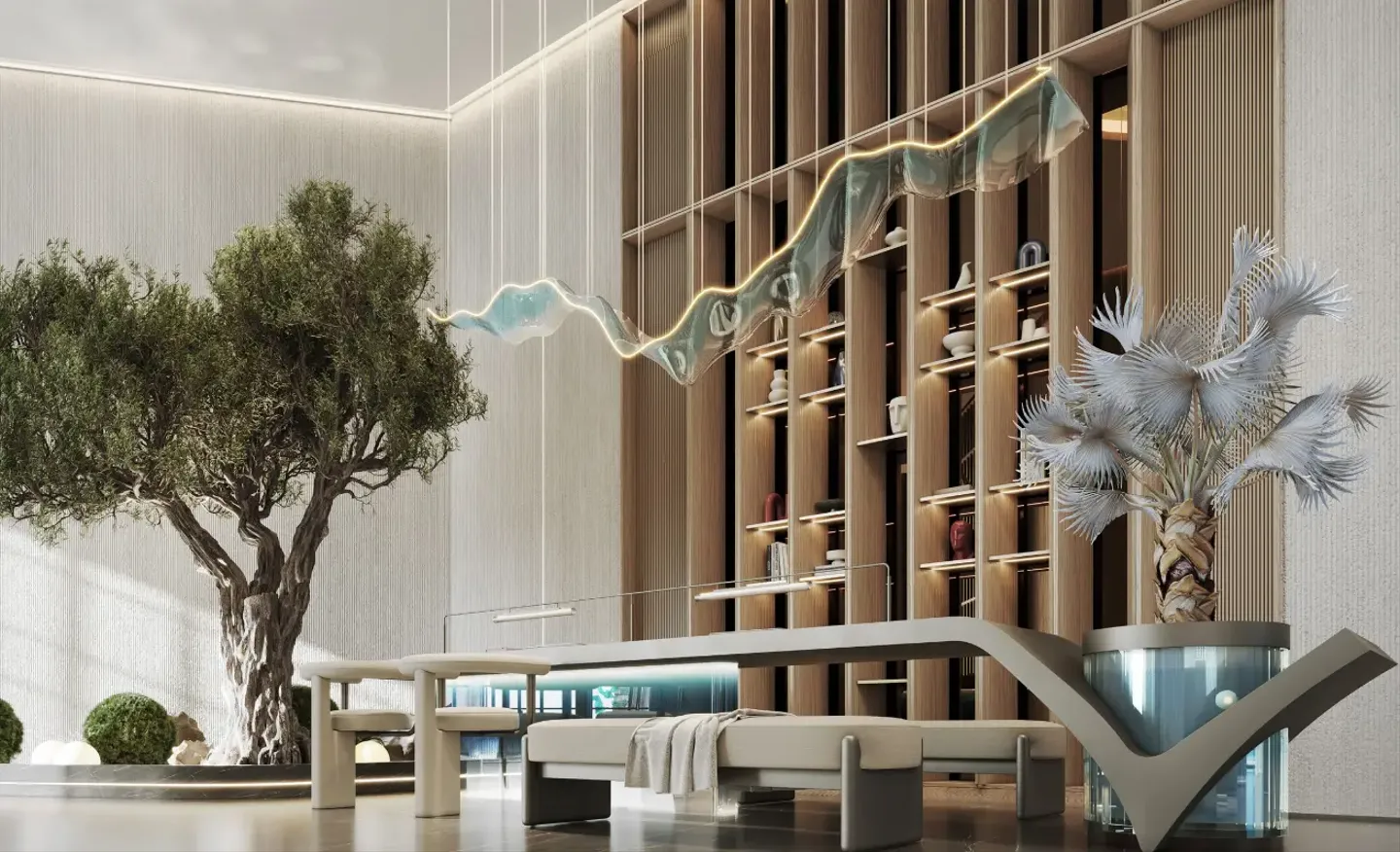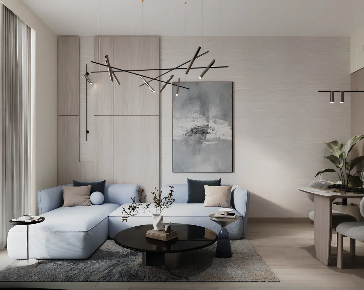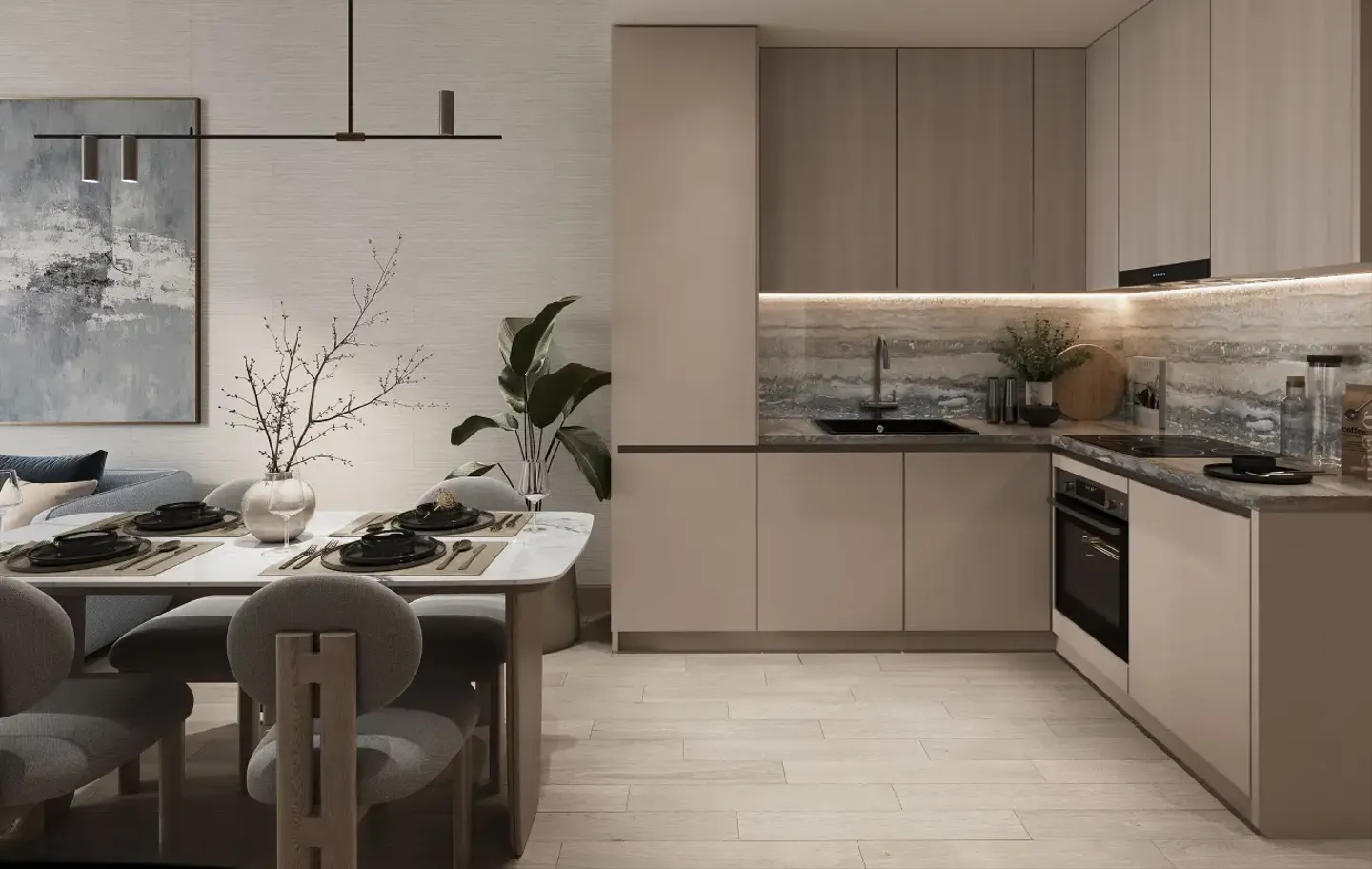 The project offers studios and apartments with one and two bedrooms, as well as retail units. The interiors feature a calm aesthetic with clean lines and natural light, while the apartments are equipped with modern kitchen appliances and a smart home system with Alexa support.